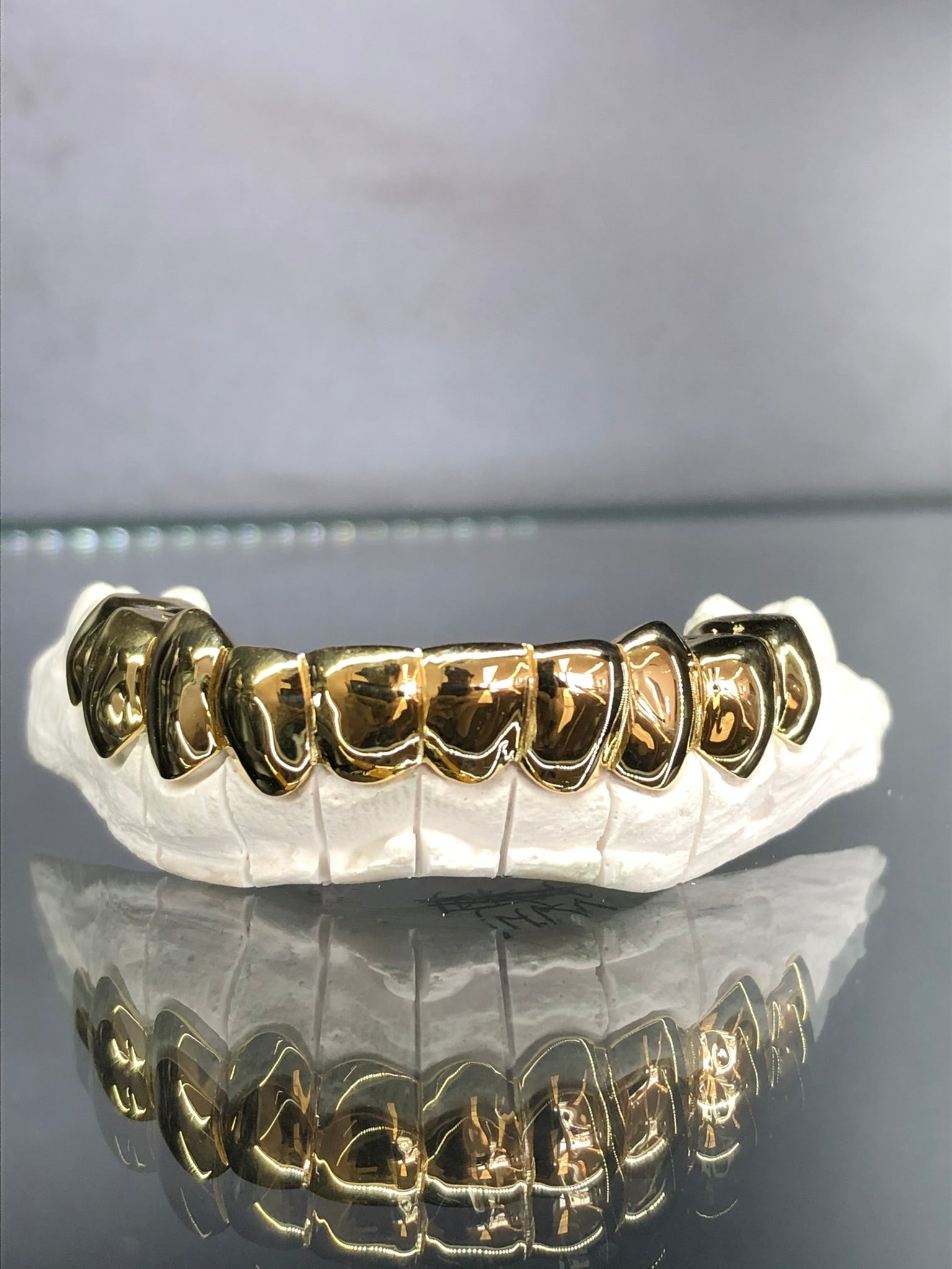 Elevate your style with our precision-crafted 10-piece gold grillz set, featuring deep cuts for a bold look.