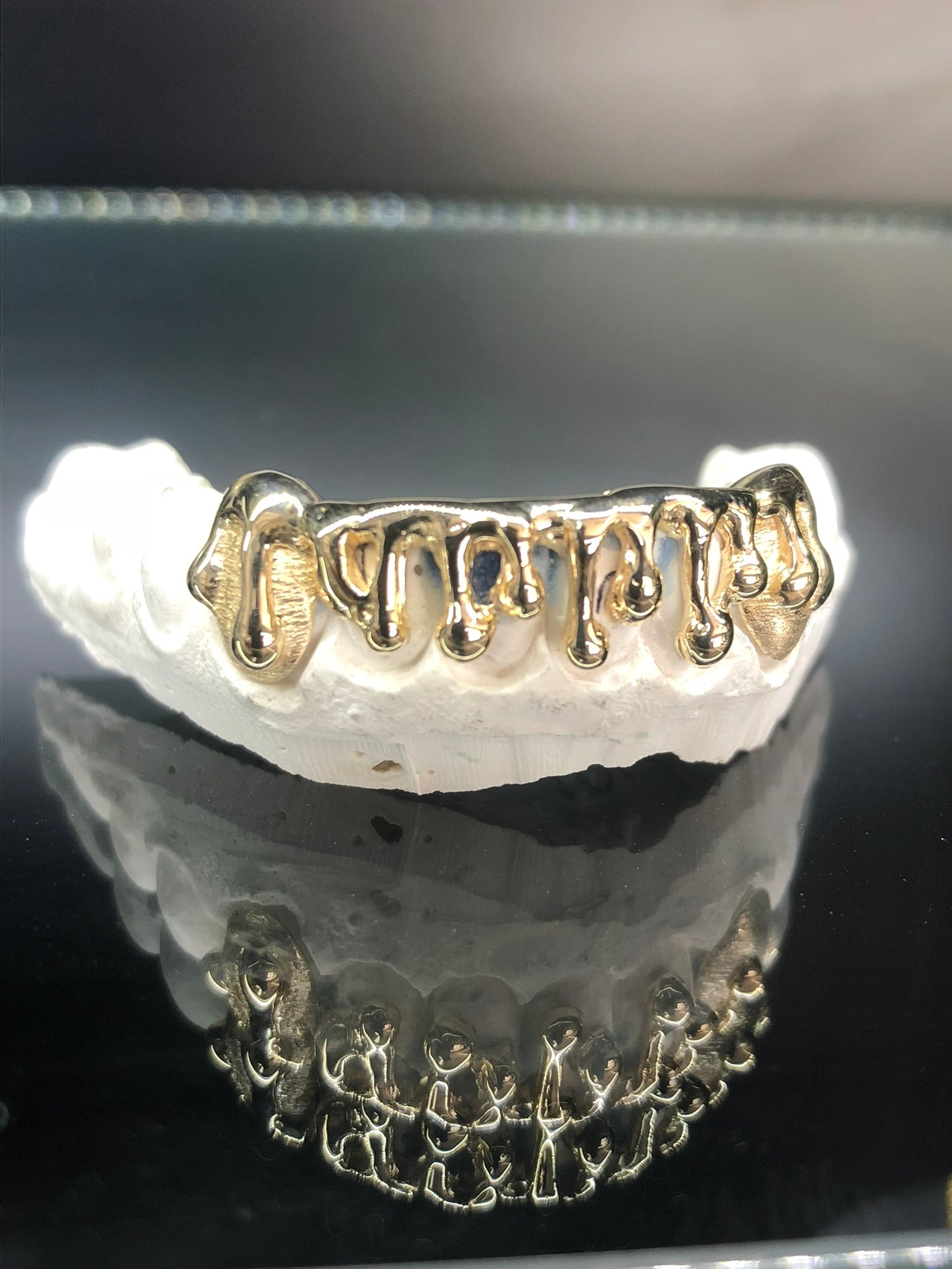 Open Face Drip features a liquid metal dripping design with cutout space to show teeth.