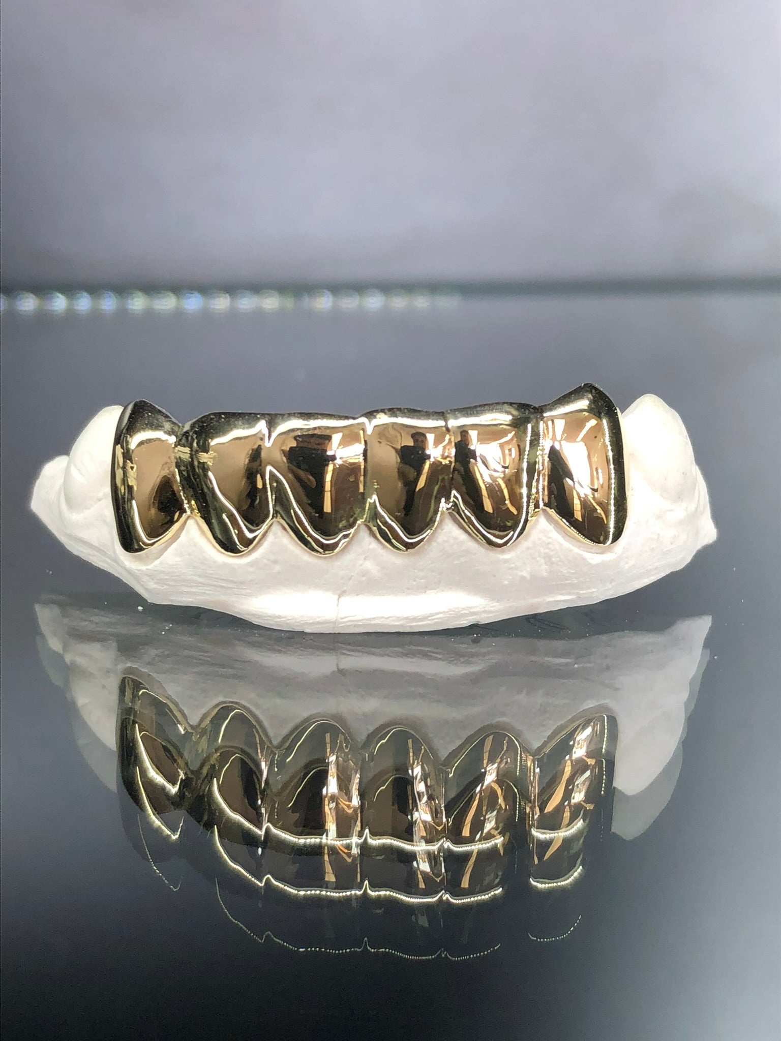 Achieve a sleek and sophisticated look with our precision-crafted 6-piece gold grillz set, featuring a high-polish finish for timeless elegance.