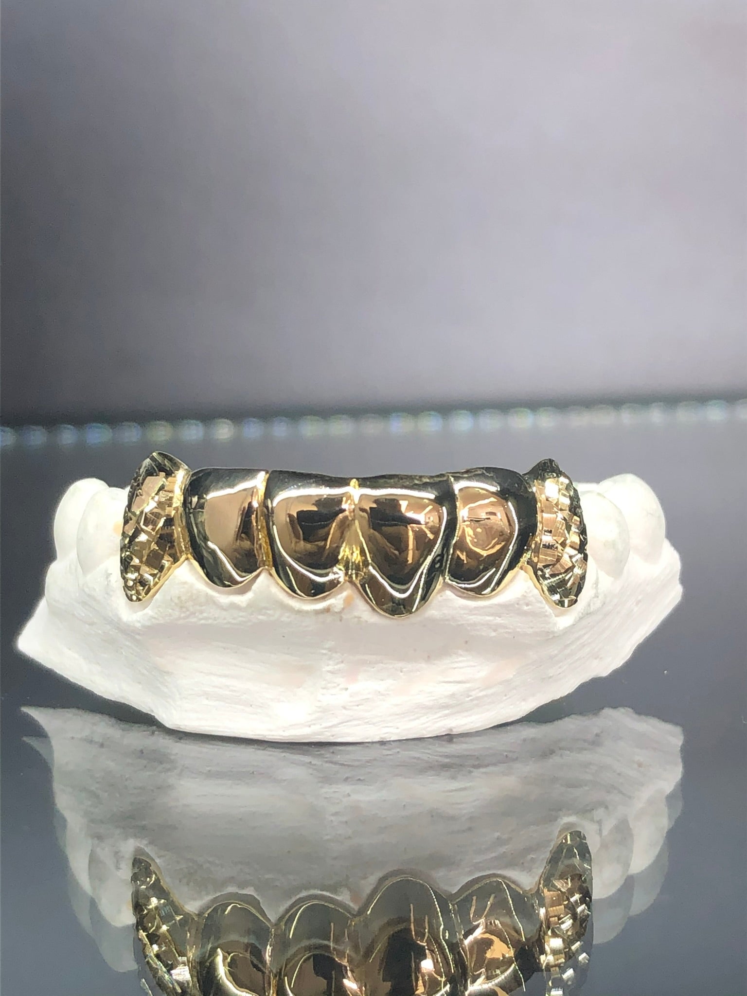6 Piece Grillz with solid gold middle-high polish and starburst diamond cut on fangs.