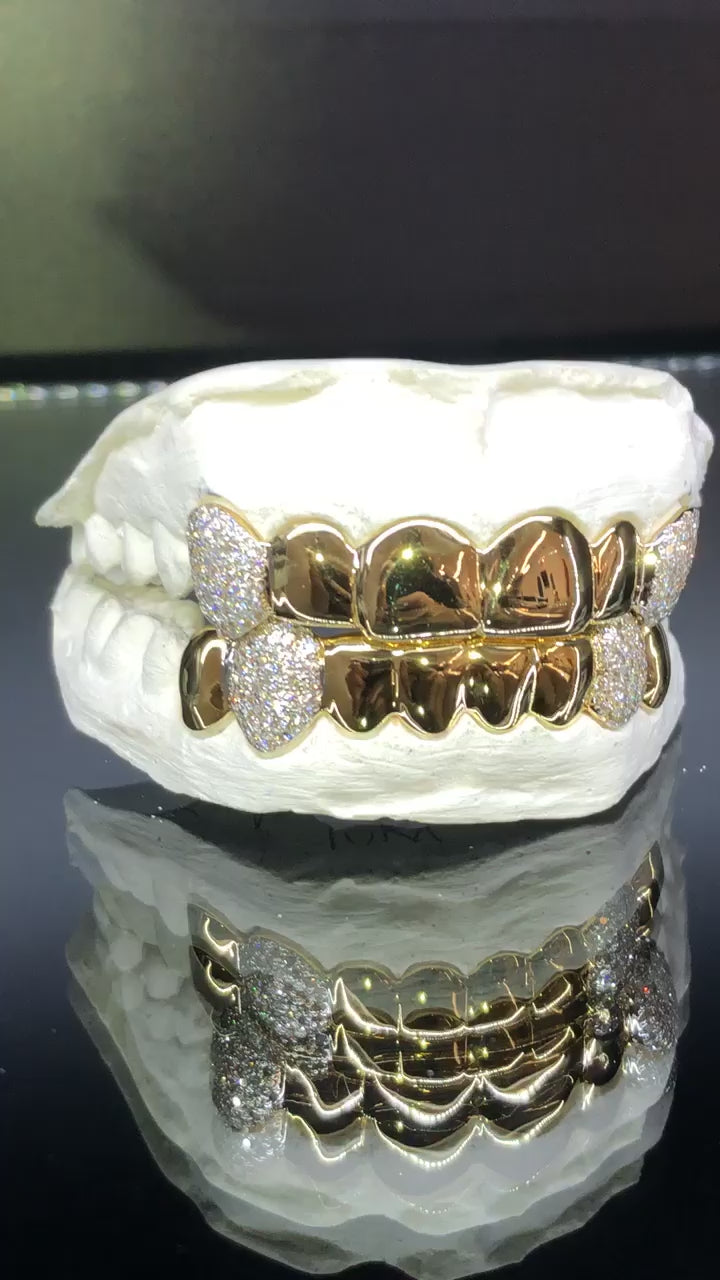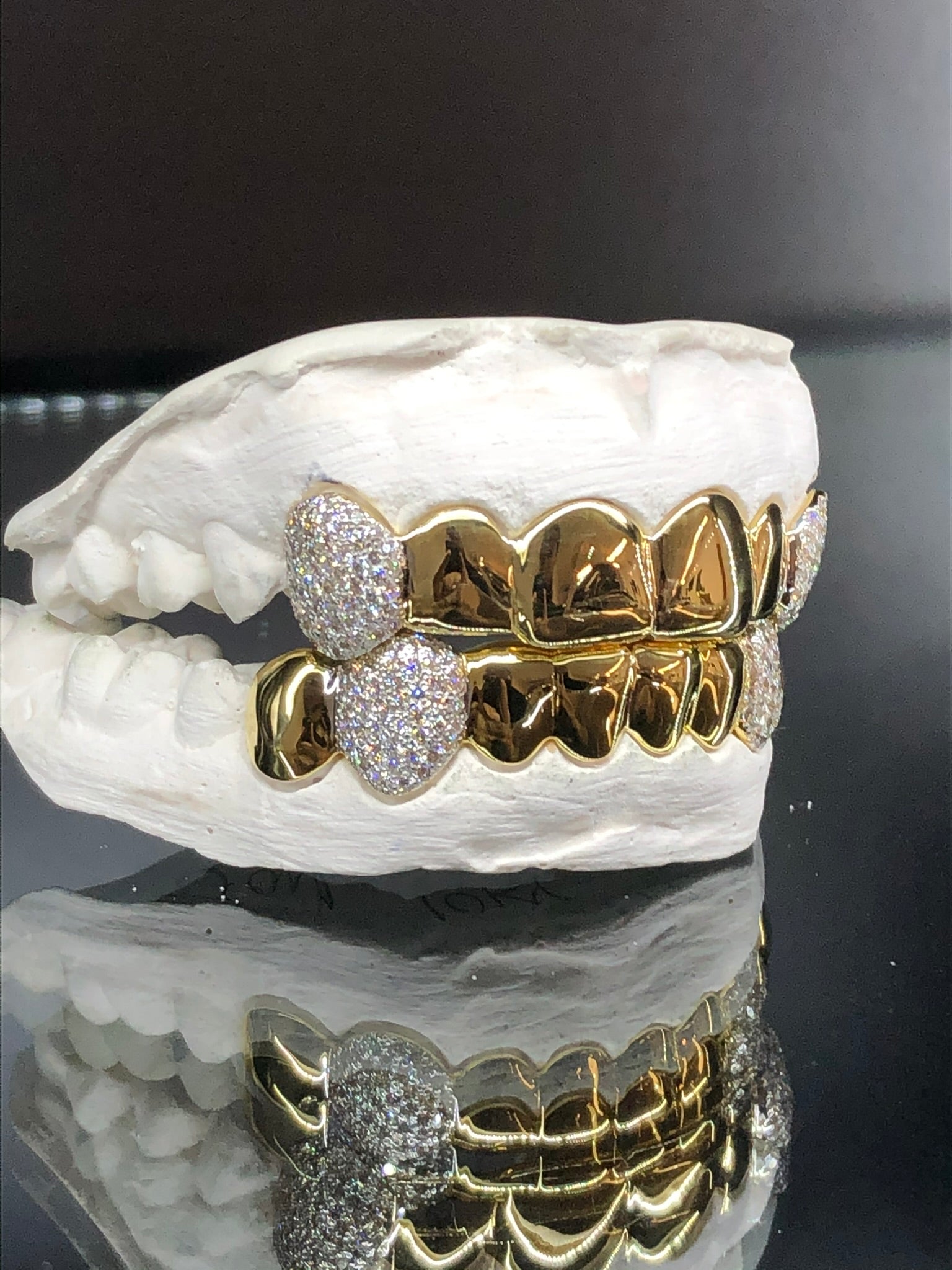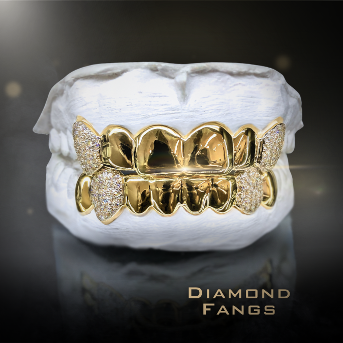 14 Teeth Diamond Grillz - 6 Tops and 8 Bottoms with Gold and Diamond Fangs.