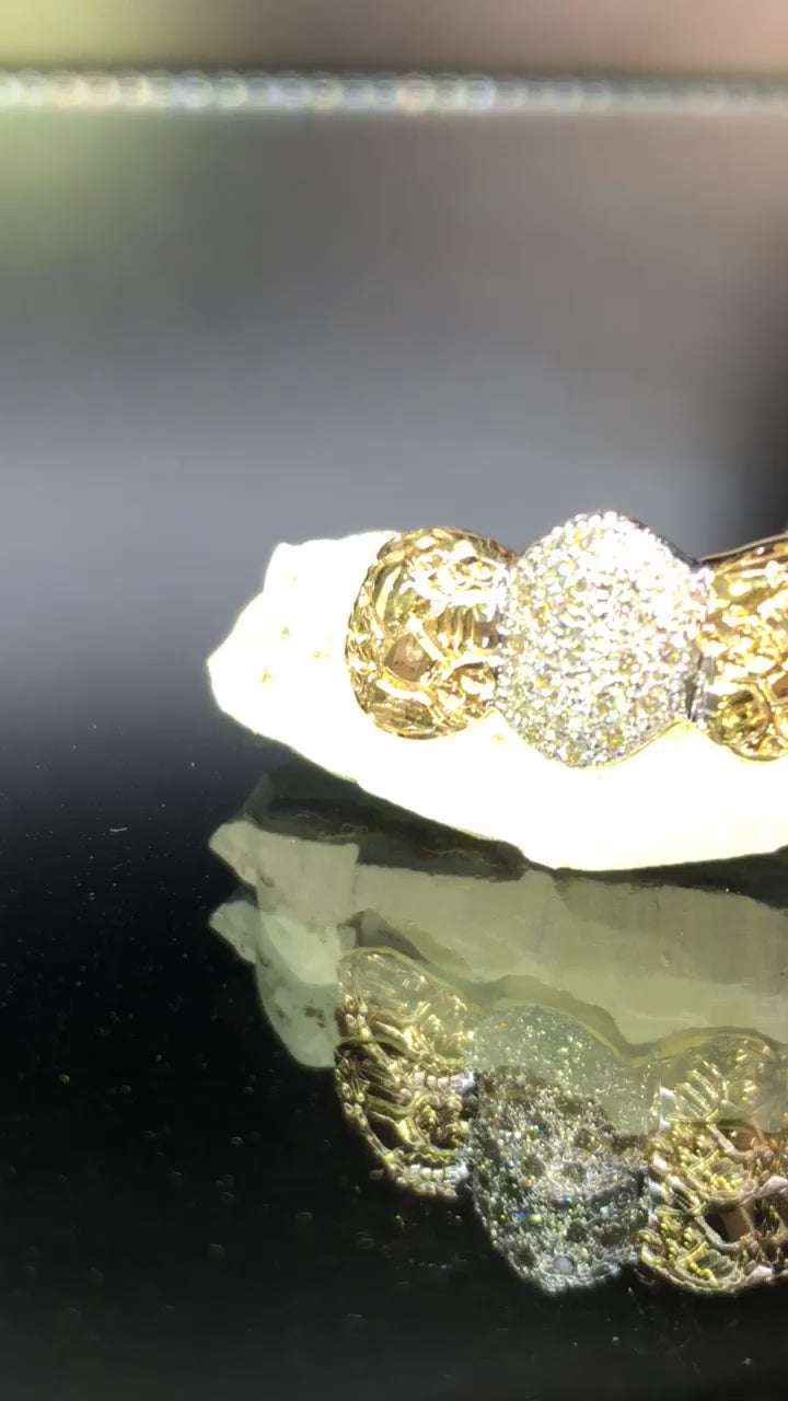 8 Teeth Gold Grillz with Nugget Texture and Micro-pave Diamond Fangs - Choose 8 Tops or Bottoms.