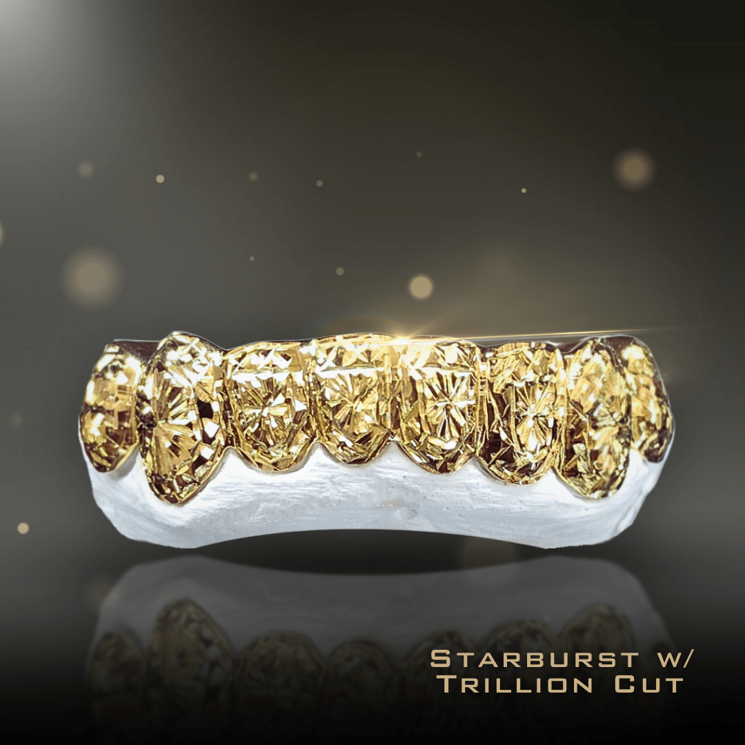 Make a statement with our precision-crafted 8-piece gold grillz set, featuring a bold Starburst pattern enhanced with Trillion Cut details for a unique and edgy look.